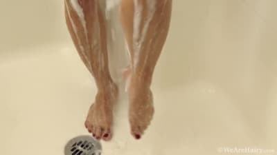 La nana va se doucher et va laver intensément sa grosse chatte remplie de poils, elle va se caresser et se peloter les seins en touchant ses petits tétons