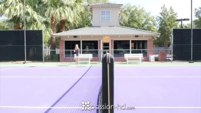 Cette belle blonde est au bord du court de tennis et le regarde jouer. Elle va se caresser avant de l'allumer.