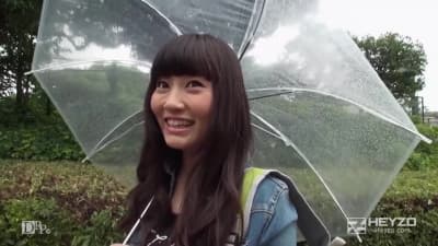 La jeune japonaise va d'abord sucer discrètement en public, finalement à cause de la pluie ils vont décaler à l'hôtel pour une baise au chaud.