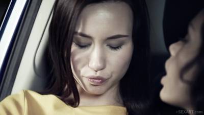 Les deux superbes actrices Sophie Lynx et Taylor Sands, toutes deux seuls dans la voiture, en profitent pour baiser.