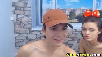 Une jeune brune avec un serre tete minnie va faire une fellation a son copain à casquette et en montrant ses seins
