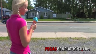 Elle part s'acheter une glace pour se caresser avec. Elle étale la glace autour de ses lèvres et sur son petit clito tout stimulé en passant sur ses tétons