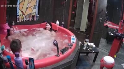 Les filles s'amusent au jacuzzi et le mec les rejoints. Le type se fait sucer et devient excité. Le trio passe au salon, afin de continuer la baise.