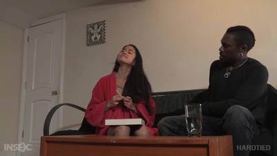 Cette demoiselle va venir chez un lascar black pour une séance de bondage, elle va d'abord se faire attacher et goder la chatte avec un vibro bonus.