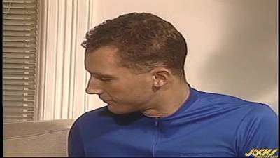 Le type a finit sa promenade en vélo et se branle. Pendant ça, un autre mec se branle aux vestiaires, avant de se faire sucer la queue.