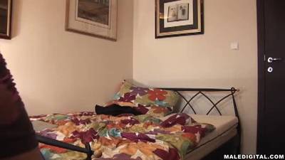 Confortablement installé sur son lit, le mec va regarder du porno t se branler. Il va éjaculer bien fort sur lui même