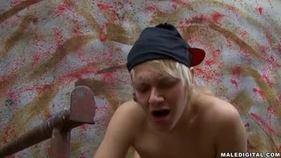 Le petit blondinet lèche le fion de son copain, accroché à un échafaudage. Il va ensuite se faire enculer en levrette et se faire jouir sur le cul