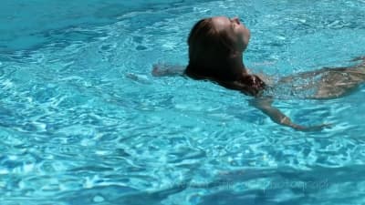 La magnifique mira à la chatte entièrement épilée va se masturbée sensuellement sur son matelas en plein milieu de la piscine
