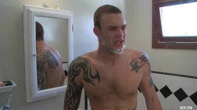 Le mec se rasait, mais son pote a très envie de baiser avec lui. Il commence à le sucer dans la baignoire, puis se fait prendre en levrette anale