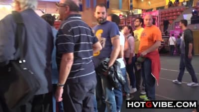 Une salope brune se donne en spectacle devant de nombreux hommes et se masturbe ensuite intensément avec un gode !