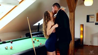 La charmante demoiselle blonde fait une petite partie de billard, elle va préférer jouer avec la vraie queue, jolie piercing!