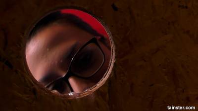 Brune à lunettes se fait arroser de sperme dans le gloryhole