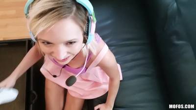 La jolie blonde amatrice de jeux en ligne va se faire chauffer par son mec, elle va faire pause pour sucer et se faire limer.