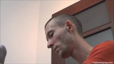 Le gars va bouffer les pieds de son mec par dessus a chaussette et va lui retirer pour gober le pieds dans a bouche pendant que l'autre tape une branlette