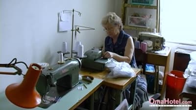 Cette vieille couturière s'excite pendant le boulot. Elle commence à se déshabiller et à se caresser, mettant ensuite un gode dans sa chatte poilue