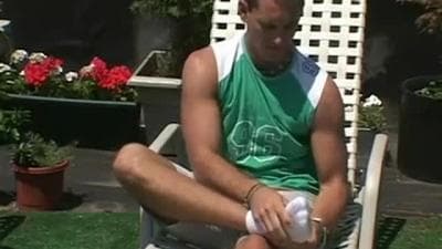 Ce beau brun retire ses chaussettes et se fait un massage aux pieds avant de les mettre dans sa bouche pour se donner du plaisir.