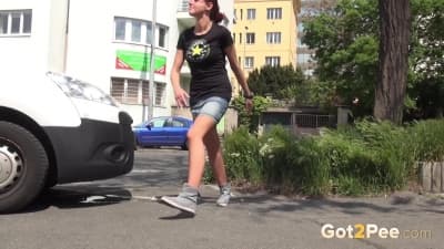 La jeune brune pisse dans la rue, la pute ne connaît aucune inhibition et laisse sa pisse sortir du trou au milieu de la rue.