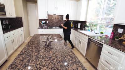 Les deux jeunes vont commencer à baiser alors que la daronne est dans la cuisine, ils vont continuer au calme dans le salon.