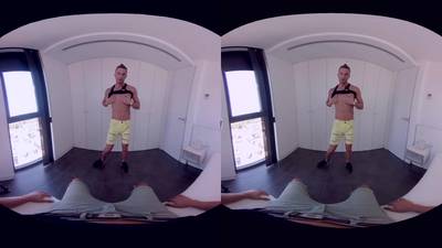 Ce beau mâle à la queue de cheval sait s'y prendre avec la bite du mec en réalité virtuelle. Il se frotte, il s'empale sur sa verge et le branle.