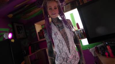 Anuskatzz s'amuse avec plusieurs godes et suce la bite tatouée de son mec. Le couple pratique la sodomie et à la fin la fille prend une faciale