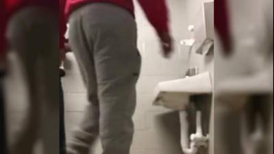 Les deux mecs s'enferment dans les WC publiques, ils pratiquent la sodomie sur le lavabo en levrette debout avec une éjac interne à la fin