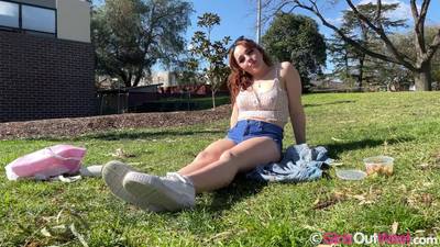 La gonzesse se pose à coté de son miroir, elle va se caresser, utiliser son gode et le vibromasseur. Elle se titille le clitoris.