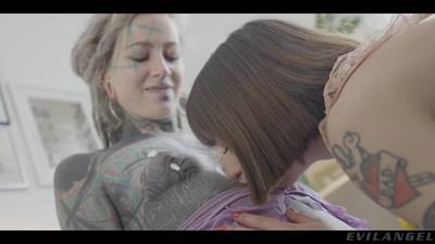 Femme entièrement tatouée adore goder sa copine