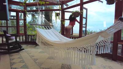 La bombasse blackette va faire grimper la température ! Elle se dénude dans le beau jardin exotique, elle se balade et se gode.