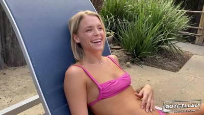 Evelyn à très envie de se faire défoncer après un bronzage au bord de la piscine. Il va lui remplir la chatte de son sperme