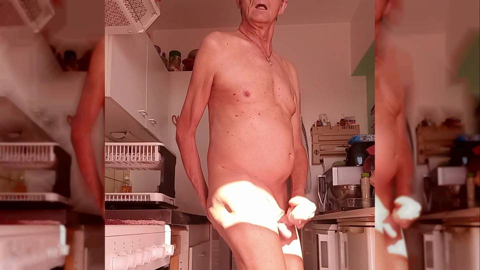 Vieil homme jouant avec sa bite dans la cuisine de sa maison, profitant de la bonne sensation avant de jouir en enregistrant sur la caméra.