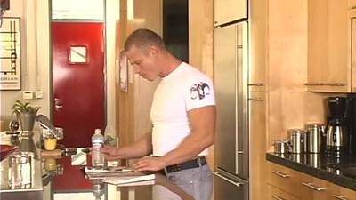 Jonas commence à se caresser et se masturber dans sa cuisine en regardant un magazine xxx et termine en cumshot sur le ventre.