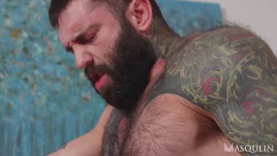 Milo Madera a un trou du cul serré et un amoureux des fesses, papa barbu tatoué au torse poilu, Markus Kage va lui pilonner le trou du cul.