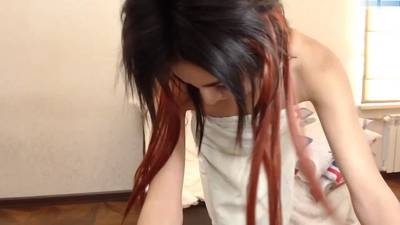 Une teen asiatique aux petits seins est assise par terre et masturbe sa chatte affamée à l'aide de ses doigts et de jouets sexuels.