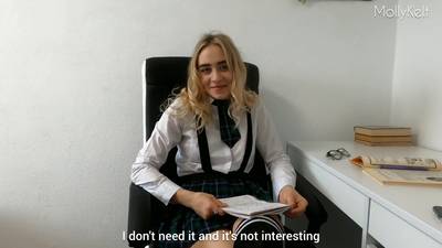 Une jeune blonde attend un examen, mais le professeur, à la vue de ses seins et de sa chatte humide, préfère la baiser et lui donner une bonne note !