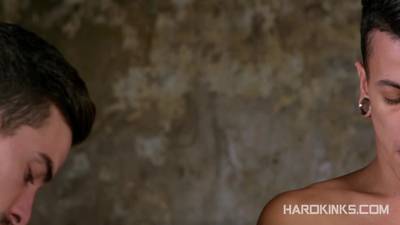 Dans cette vidéo de domination, un duo gay est soumis à un gangbang brutal de la part de quatre stars du porno. C'est une bataille de bites et de BDSM !