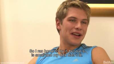 Roger Lambert se présente au début de la vidéo porno. Nu, le jeune blond commence à se branler et éjacule sur son propre ventre.