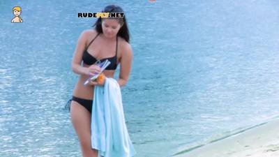 Brunette avec des petits seins se promène sur la plage naturiste et se passe la crème, assise sur sa serviette.