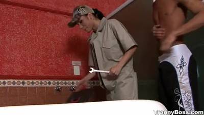 Il a des problèmes avec la douche et appelle Kalena pour la réparer. Ils deviennent vite excités et elle ne peut résister à l'envie de lui enfoncer sa bite