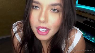 La déesse brune en vêtements blancs sexy, se masturbe la chatte jusqu'à ce qu'elle jouisse, dans cette vidéo amateur.