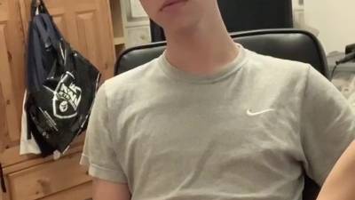 Un jeune gay enlève son short gris et branle sa grosse bite en érection sans arrêt jusqu'à ce qu'il éjacule dans sa vidéo amateur.