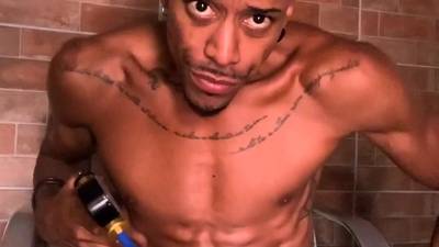 Yuri Oberon, nu et excité, pompe sa longue bite avec un sex toy, en solo. Il aime se branler et jouir, seul.