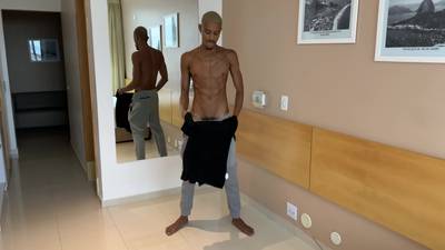 La star du porno gay amateur du Brésil, Yuri Oberon, se déshabille et se branle sur sa longue bite noire, alors qu'il est immobile.