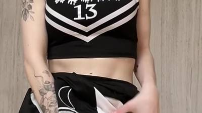 Une brune aux gros seins dans son uniforme de cheerleader se masturbe et se doigte jusqu'à ce que son sperme coule à flots.