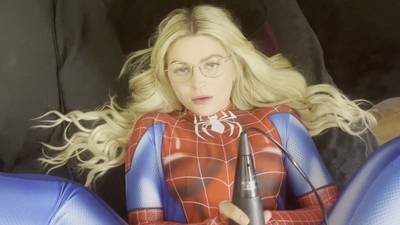 Cette blonde sexy et excitée, vêtue d'un costume de Spiderman, suce la bite de son petit ami pour le baiser ensuite et recevoir son sperme dans sa bouche.