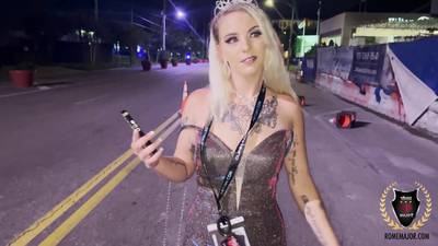 Un homme noir qui fait un vlog dans la rue trouve une fille blonde qui se promène et l'invite à se faire baiser dans sa voiture.