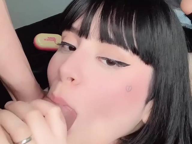 Une belle brune en lingerie noire sexy s'agenouille devant son amant avec son pénis dans la bouche et l'avale comme une pro.