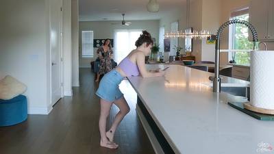 La maitresse de Mama Fiona entre dans la cuisine avec un strapon, domine la fille et la baise debout par derrière comme la pute qu'elle est !