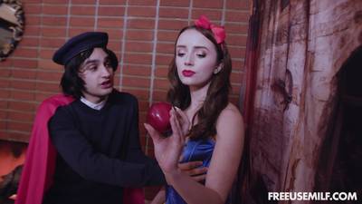La salope se déguise en Blanche-Neige et suce bien sa longue bite. Le gars la baise bien devant le feu et la fait gémir.