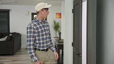 L'homme à tout faire voulait parler à la propriétaire mais il l'a trouvée nue sur son lit, en train de se tripoter. Elle le surprend en train de regarder.