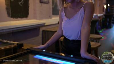 Une milf blonde aux gros seins et un client se retrouvent le soir dans le bar d'un hôtel. Il la soulève, lui donne sa bite à sucer et la baise debout.